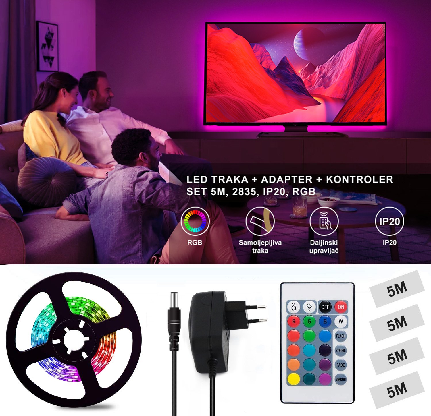 LED traka+adapter+kontroler - set 5M 2835 IP20 RGB